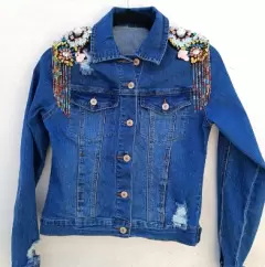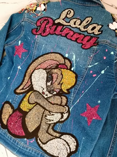 Chamarra con aplicaciones de Lola Bunny, talla Ch, viene amplia, mezclilla strech.