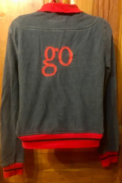 Chamarra tipo mezclilla con detalles en cuello y mangas en rojo, letras traseras: “go”. Talla mediana pero está algo reducida. 98% algodón, 2% elastano. Hecha en Perú.