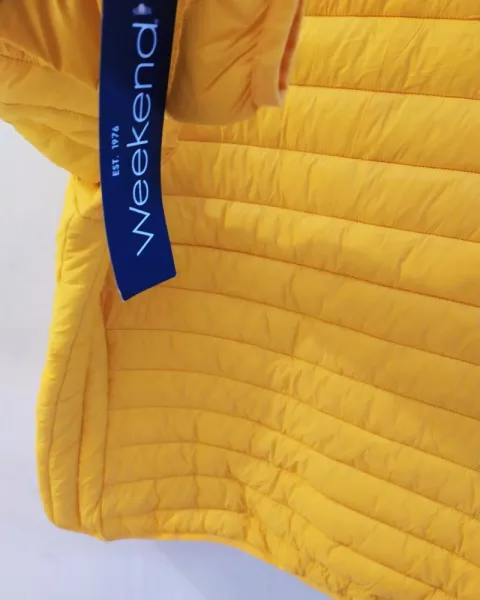 Padrísima y lucidora chamarra nueva amarilla Weekend, ideal para regalar, talla extra grande, dice talle 38 pero considero que viene mucho más grande, es como un 40 pero mejor Checa medidas: de axila a axila mide 61 cms, igual cintura, de largo 69 cms. Viene con su bolsita para comprimir