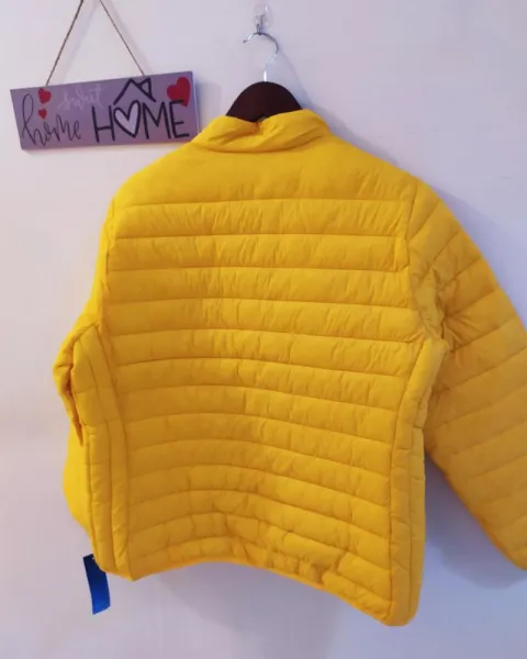 Chamarra nueva amarilla. Padrísima y lucidora chamarra nueva amarilla Weekend, ideal para regalar, talla extra grande, dice talle 38 pero considero que viene mucho más grande, es como un 40 pero mejor Checa medidas: de axila a axila mide 61 cms, igual cintura, de largo 69 cms. Viene con su bolsita para comprimir