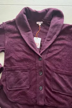 Chamarra peluche morada, viene una combinaciòn de dos telas se puede apreciar en la tercer foto, el cuello es de solapa con bolsillos al frente y botones.Medidas:Hombro a hombro: 68 cmAxila a axila: 66 cmLargo: 69 cm