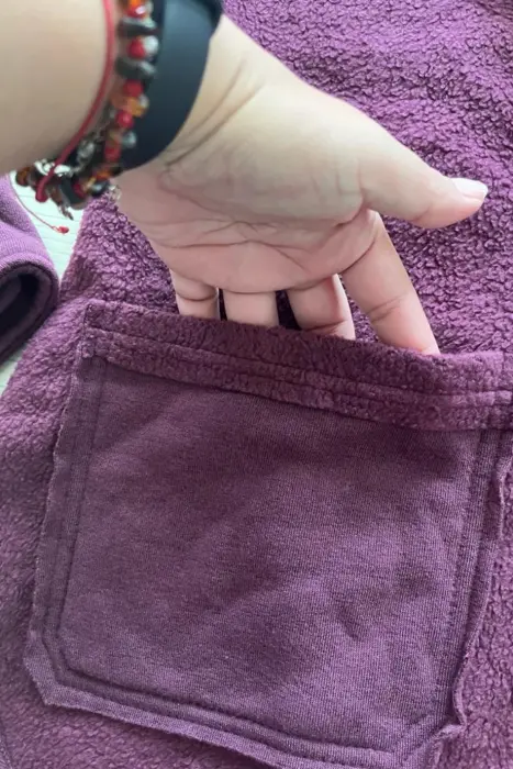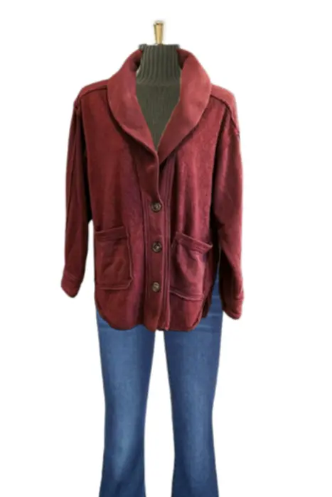 Chamarra peluche morada. Chamarra peluche morada, viene una combinaciòn de dos telas se puede apreciar en la tercer foto, el cuello es de solapa con bolsillos al frente y botones.Medidas:Hombro a hombro: 68 cmAxila a axila: 66 cmLargo: 69 cm