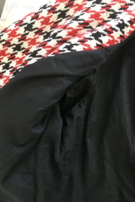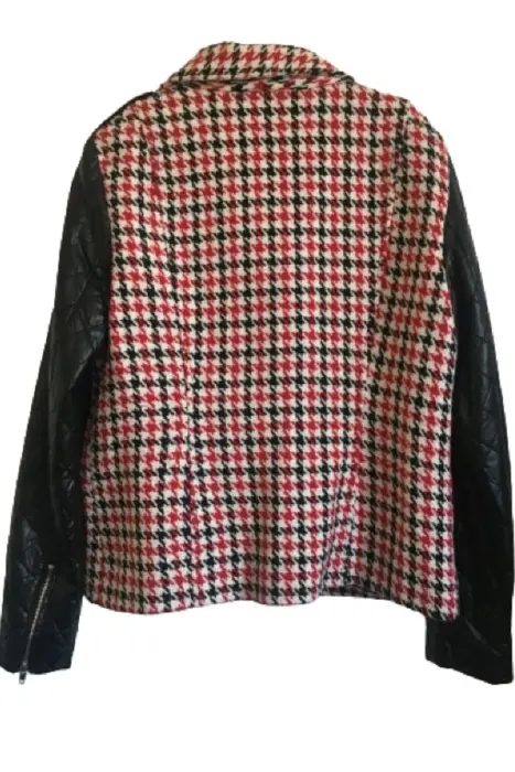 Chamarra perfecto - motociclista con estampado tejido tipo Tweed (pata de gallo) color blanco, negro y rojo (está un poco desgastado). Forro interno, mangas de vinipiel acolchonado con cierre (tiene un desgaste en la costura de una de las mangas pero no es muy visible), bolsas con cierre en el frente y costados. Marca KUT, talla XL pero queda a L.
