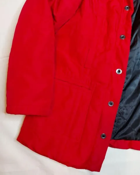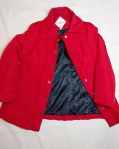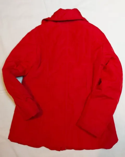 Chamarra roja calienta. Bonita chamarra roja no es ni corta ni larga, tiene bolsas al frente, es calientita y comoda, tiene presillas para poner un cinturón, pero no es necesario, tiene detalles se ven en la foto 5 como si estuviera arrugada la tela o pegada con el forro. Dice talla 30. El rojo no es tan vovo.