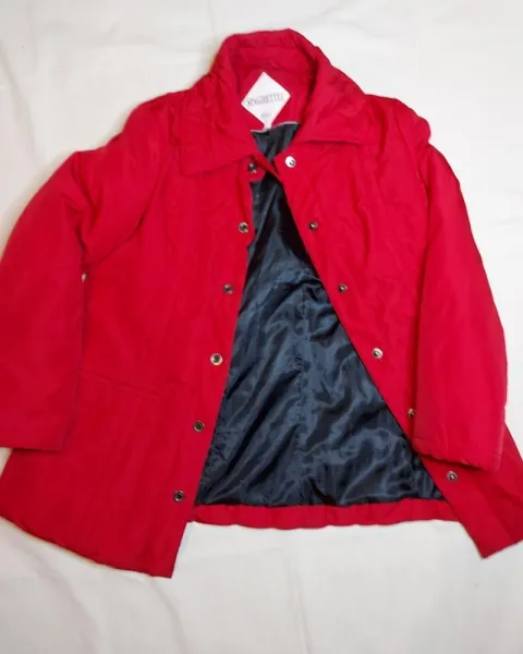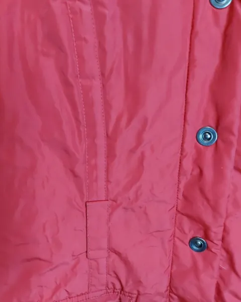 Bonita chamarra roja no es ni corta ni larga, tiene bolsas al frente, es calientita y comoda, tiene presillas para poner un cinturón, pero no es necesario, tiene detalles se ven en la foto 5 como si estuviera arrugada la tela o pegada con el forro. Dice talla 30. El rojo no es tan vovo.