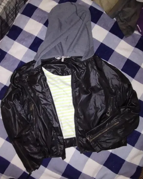 Chamarra rompe vientos corta con gorro. Chamarra con detalle en el interior frangas grises con amarillo.Gorro color grisCon detalles de cierres en las mangas Resorte en el borde inferiorBuen estado y aún súper precios