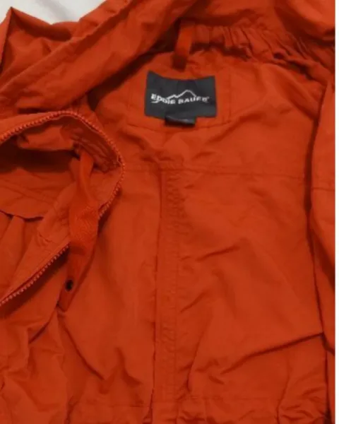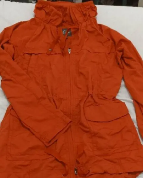 Chamarra rompevientos tipo gabardina. Chamarra rompevientos tipo gabardina color naranja, con cordones ajustables en cuello y cinrura, talla MSin ningún uso