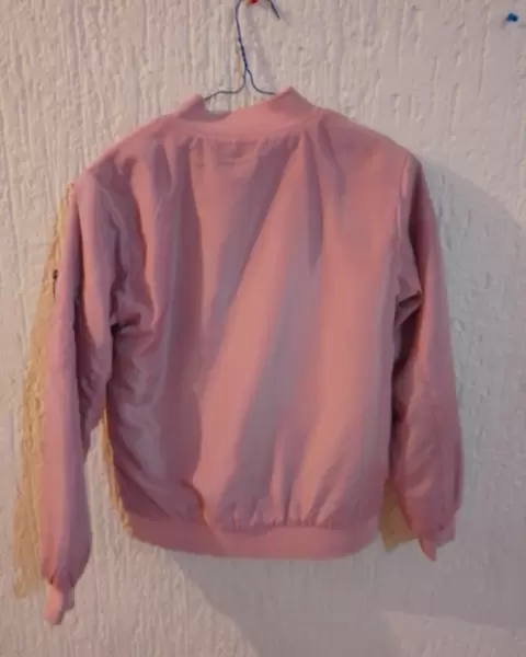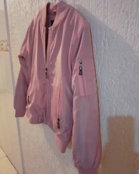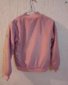 Chamarra rosa casual. Es una chamarra casual, con un diseño muy fresco, cuenta con cierre en bodas y en brazo izquierdo, tiene elástico en cintura, da muy bonita forma.Es talla 16