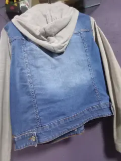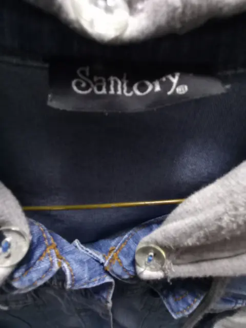Chamarra santory. De mezclilla, sin detallesTalla medianaLlega a la cadera, tiene gorro y mangas de tela
