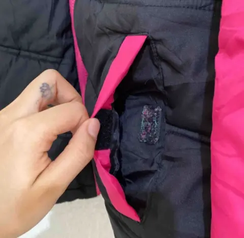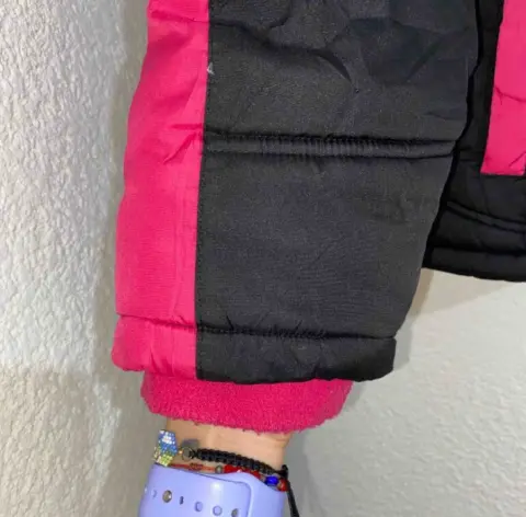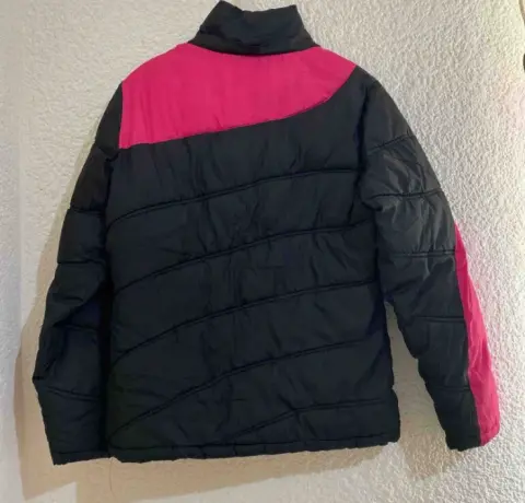 Chamarra rosa con negro, es súper calientita, talla 14-16 pero viene grande y queda a S de adulto. Para montaña o para fríos muy fuertes. Está intacta, tiene mucha vida, con dos bolsas a los lados y estás se cierran con velcro, también trae una bolsa adentro y está igual se cierra con velcro. Único detalle: no trae gorro, pero se lo puedes agregar.