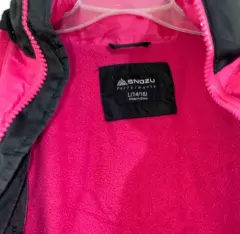 Chamarra Snozu. Chamarra rosa con negro, es súper calientita, talla 14-16 pero viene grande y queda a S de adulto. Para montaña o para fríos muy fuertes. Está intacta, tiene mucha vida, con dos bolsas a los lados y estás se cierran con velcro, también trae una bolsa adentro y está igual se cierra con velcro. Único detalle: no trae gorro, pero se lo puedes agregar.