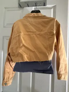 Chamarra de moda, muy original, no está mal tomada la foto así es el corte, se ve muy padre Es color mostaza combina perfecto con jeans de mezclilla o negros y una playera linda TALLA XS