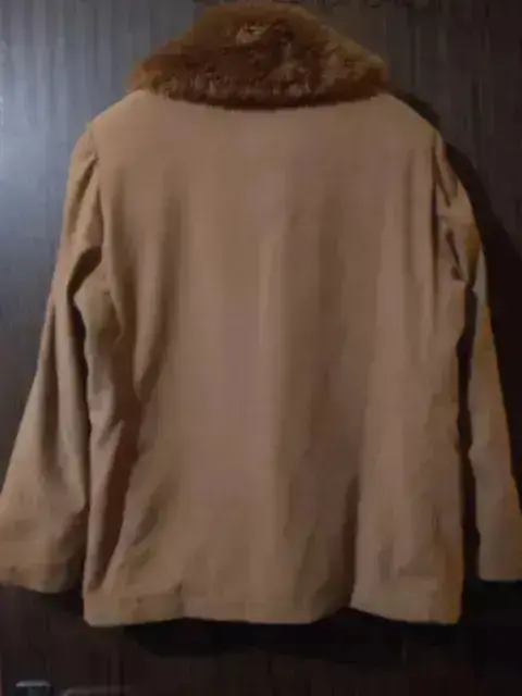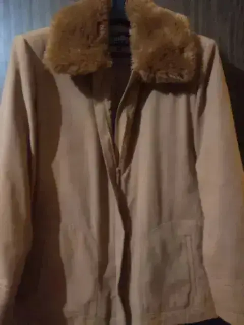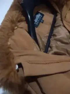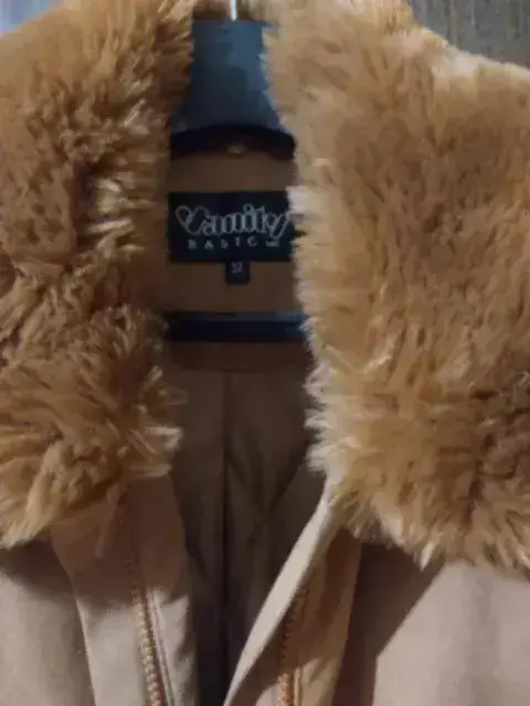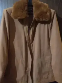 Chamarra camel, tela suede y cuello de peluche (pelo suave y fino?Talla 32Corte recto, con cierre y solapa para ocultarlo.El cuello es desmontable