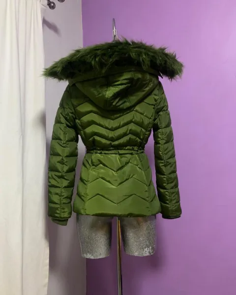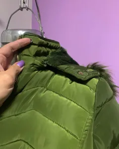 Preciosa chamarra verde militar, brilla muy bonito. Es talla chica, se le desmonta el gorro y por dentro es calientita. Sus medidas son: 60cm de largo, 56cm de manga y 42 cm de axila a axila.