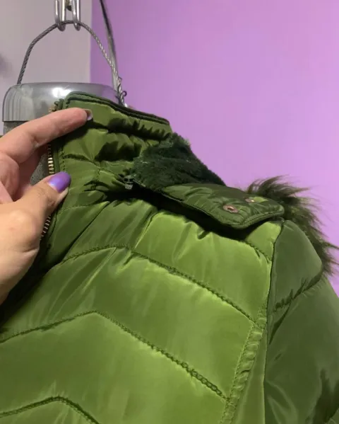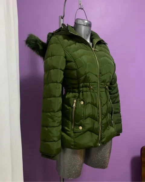 Chamarra verde. Preciosa chamarra verde militar, brilla muy bonito. Es talla chica, se le desmonta el gorro y por dentro es calientita. Sus medidas son: 60cm de largo, 56cm de manga y 42 cm de axila a axila.