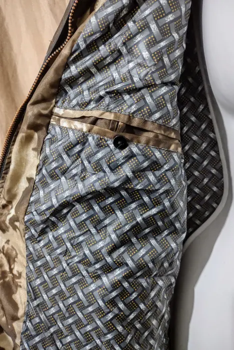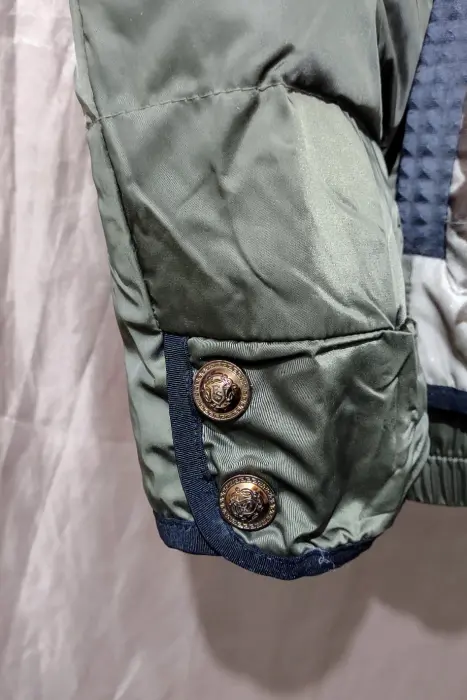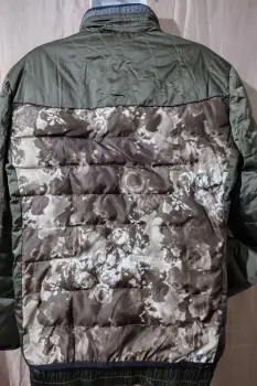 Chamarra verde con impresión de camuflaje. Nueva, talla L.Con cierre de metal al frente, resorte en la parte de abajo, tiene forro con bolsa interna a cada lado, en la parte exterior con bolsas laterales, broches con aplicacion en los puños.