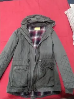 Chamarra verde con forro rojo de cuadros. Chamarra verde con forro por dentro de cuadros , gorro y bolsas en la parte frontal en perfecto estado