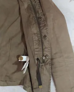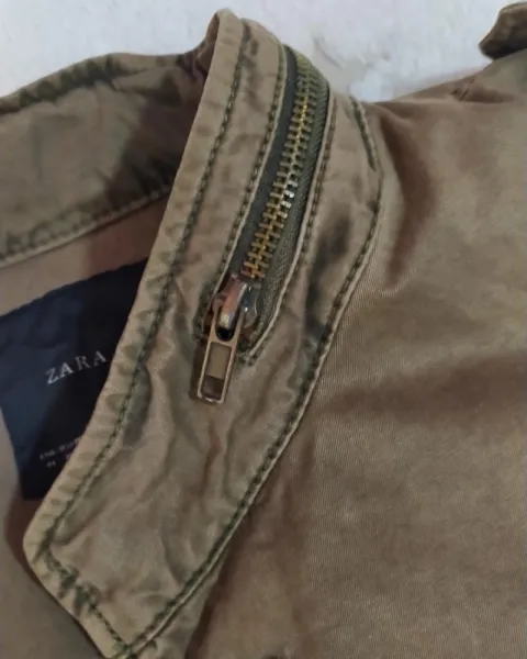 Chamarra verde olivo marca Zara, sin detalles y en perfecto estado, no tiene mucho uso, aun conserva su boton de repuesto. Tiene lazos por el interior para ajustar la cintura, el cierre del cuello solo es decoración.