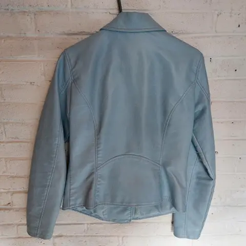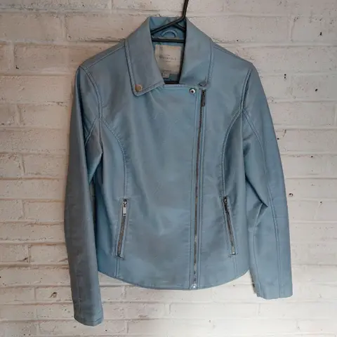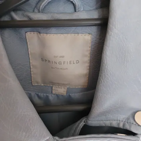 Chamarra azul cielo vinipiel SpringfieldCierre asimétricoPuesta un parvde vecesComo nueva sin detallesTalla 28ANCHO HOMBROS 38ANCHO PECHO 48ALTO 66LARGO MANGA 61.5
