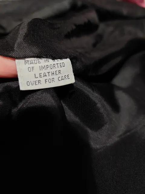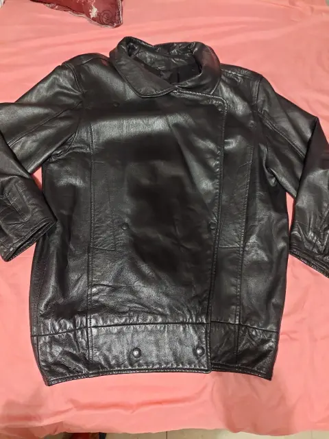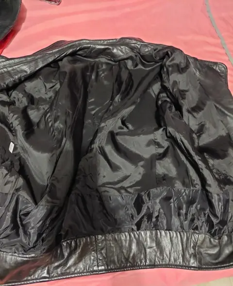 Auténtica piel muy suave y fina, tiene corte tipo motociclistas, no obstante, es larga, en foto medida, es talla XL a 1XL, pero es bombacha y angosta de cadera por lo que quedaría Oversize, está hermosa, manga larga, no tiene detalles, probablemente pintura,pero está intacta, siento que está en excelente estado. No está rota, rasgada, en las fotos se nota las medidas de axila y cadera.