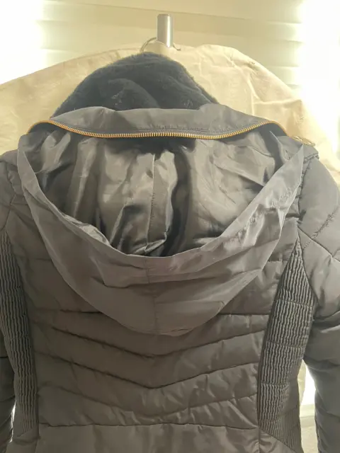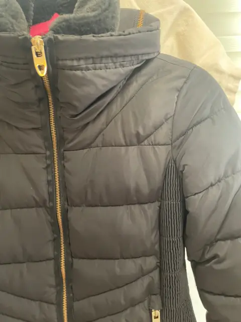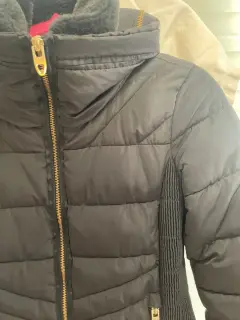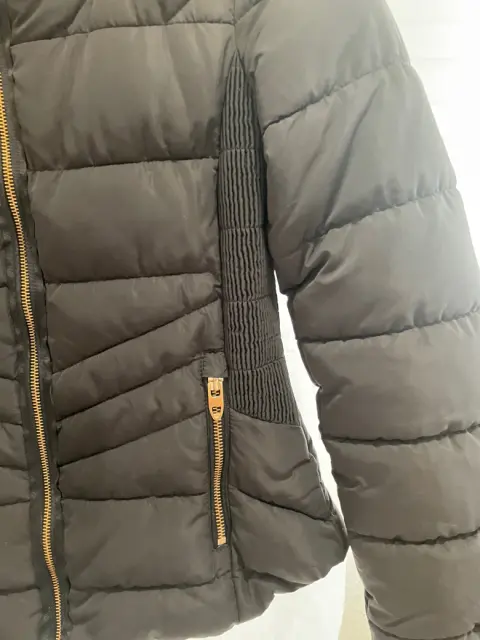 Zara Chamarra mujer Color Negro Talla 24 Material Stretch Cierre y Broches dorados Cuello Capucha con cierre Mangas con resorte Estado Usado una vez Precio 1450Medidas en centímetros Ancho hombros 38Busto 90Lado 55Largo mangas 60 Resorte en la mangas 5 cm de largo