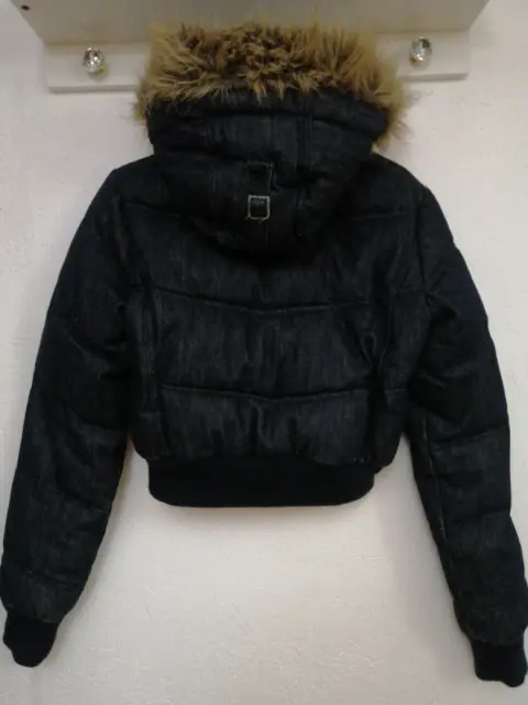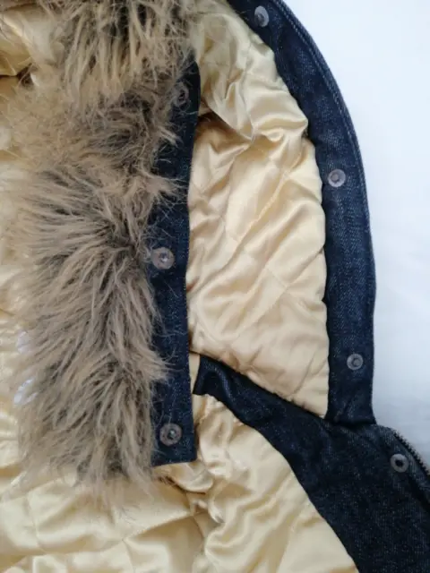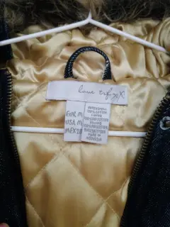 Chamarra ZARA de mezclilla abrigadora. Es una chamarra corta a la cintura con exterior en mezclilla.Colección de invierno, es gruesa con interior capitoneado en dorado, y capucha con orilla desmontable en felpa. Abrigadora, atemporal, moderna.