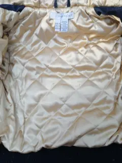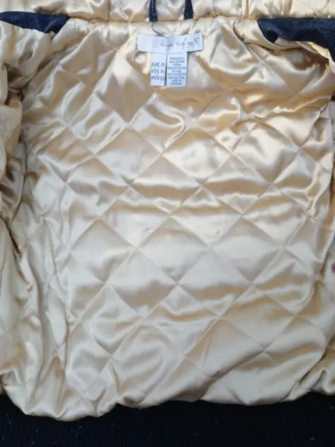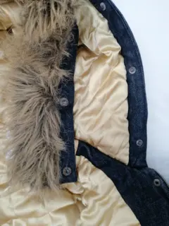 Es una chamarra corta a la cintura con exterior en mezclilla.Colección de invierno, es gruesa con interior capitoneado en dorado, y capucha con orilla desmontable en felpa. Abrigadora, atemporal, moderna.
