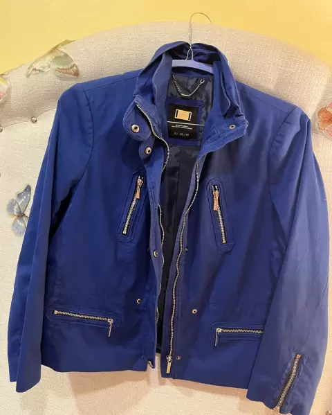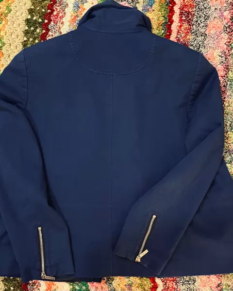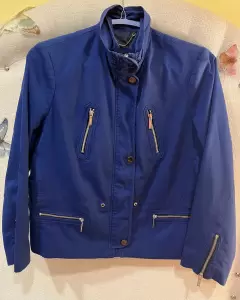 Chaqueta (Limpia se retiró de tintorería), forrada color azul pizarra, cierres color Plata, cuello alto, cierre y botones de presión al frente, dos bolsas con cierre simuladas en el pecho, dos bolsas con cierre laterales, cierres en puños. Medidas H a H 40.5 cm, A a A 56 cm Largo 57 cm. Tela 61% algodón y 39% poliéster.