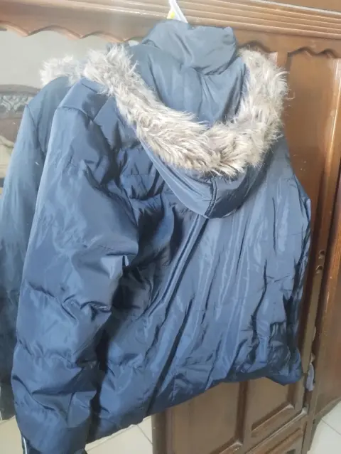 Chaqueta de dama. Chaqueta de dama, talla M, color azul, con gorra con peluche, aplicaciones en plateado, (zipper), tipo cazadora, afelpada por dentro.
