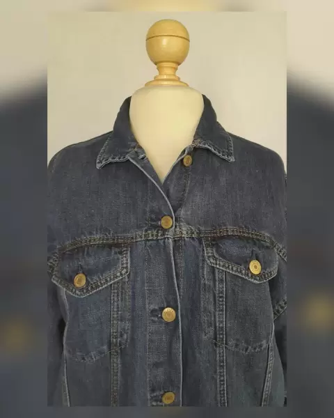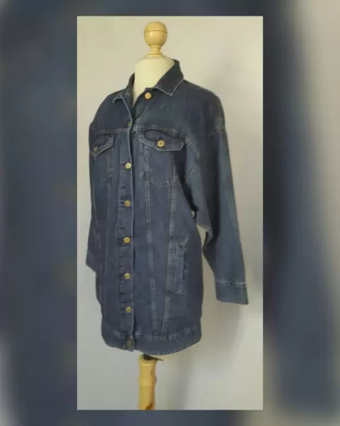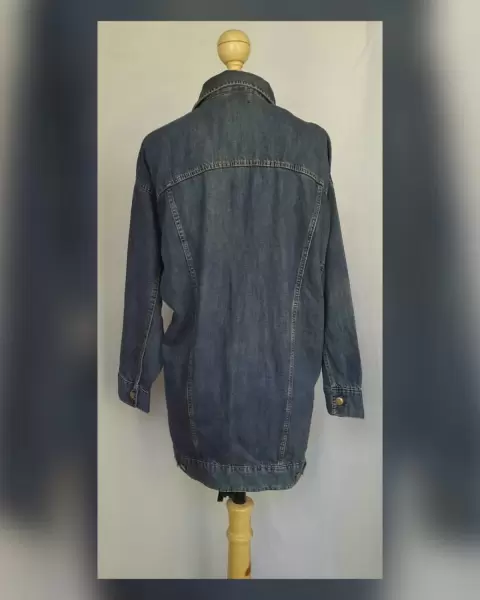 Chaqueta Denim Largo Midi. Chaqueta denim largo midi color AZUL MEDIO, cuello clásico c/solapas, cierre p/botonadura, 2 bolsos vivo frontales, 2 bolsos parche c/tapeta y botonadura y manga larga terminada en puño. Talla L. Dimensiones cms: 56 hombro, 60 axila, 50 zona baja, 86 largo, 49 largo manga. 72% algodón, 28% lino. Para lavado en casa.