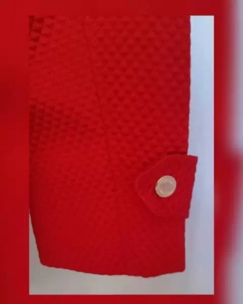Chaqueta c/estructura color ROJO FUEGO, cuello Perkins, cierre p/doble snaps tono plata patinada, 2 bolsos vivo frontales c/tapeta y snaps, manga larga terminada en tira c/snaps y forro interior. Talla 32. Dimensiones cms: 40 hombro, 52 axila, 47.5 cintura, 56 zona baja, 67 largo, 60.5 largo manga. 74% algodón, 26% poliéster. P/limpieza en seco.***NUEVA, NUNCA SE HA USADO, SE LE CAYÓ LA ETIQUETA ESTANDO GUARDADA***EL TONO DE ROJO ES BELLÍSIMO, LAS FOTOGRAFÍAS NO LO CAPTAN***