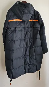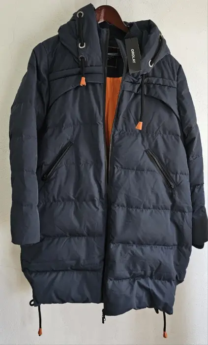 Chaqueta larga, aislamiento de plumón. Chaqueta larga azul marino, con forro naranja, aislamiento de plumón de 700 (alta calidad de aislamiento).