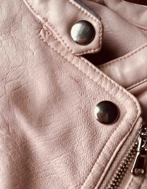 Preciosa chamarra imitación piel , es color rosa clarito. Talla 13/14 pero queda a talla XS mujer . Detalle en la parte de atrás pequeño desgaste no se percibe mucho ni afecta para nada su uso (ultima foto)