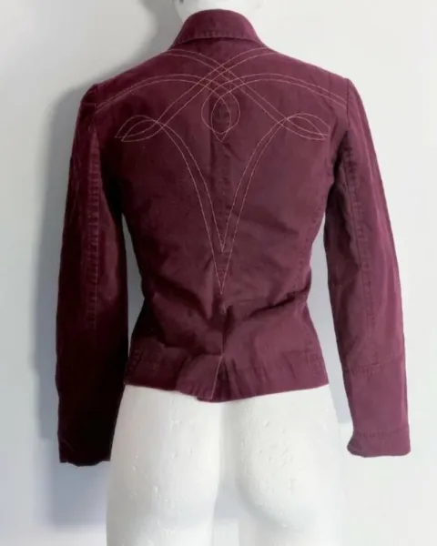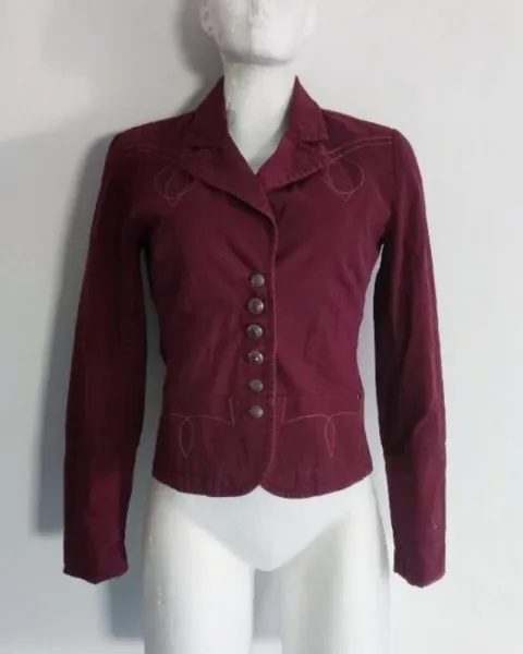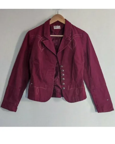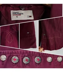 Chaqueta vino con costuras tipo cowboy. Hermosa Chaqueta con costuras de patrones tipo cowboy, es de denim Tommy Hilfiger, en color guinda-vino, botones al frente acorde al estilo, muy padres, fiel a talla S. Una joyita para tu armario.