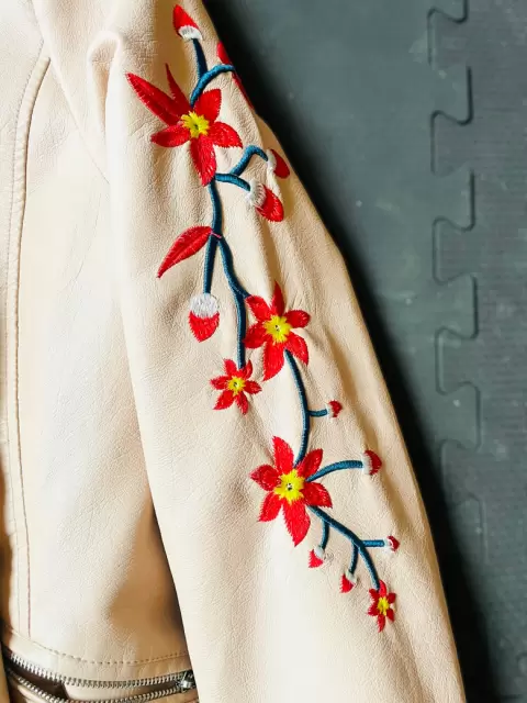 Esta chamarra por estar guardada ha tenido desgaste en la parte superior, cómo se muestra en las fotos, está marcada en talla 8