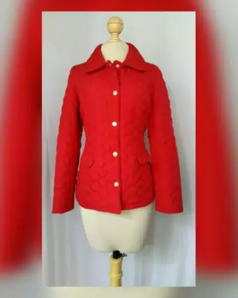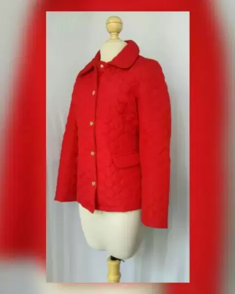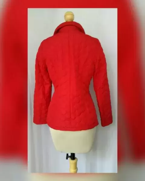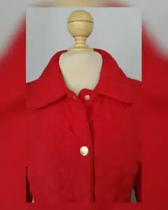 Jacket acolchada ligera en tela color ROJO FUEGO, cuello clásico c/solapas, cierre p/snaps, 2 bolsos vivo c/tapeta, bies en zona cuello, frontal y bolsos y forro fantasía interior. Talla M. Dimensiones cms: 40 hombro, 53 axila, 47 cintura, 57 zona baja, 66 largo, 61 largo manga. 100% poliéster. P/lavado en seco.***LA JACKET TIENE UN COLOR MUY BELLO QUE NO CAPTA ADECUADAMENTE LA FOTOGRAFÍA***