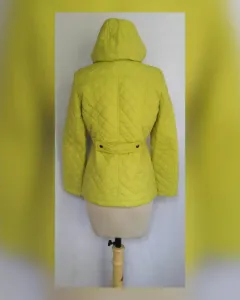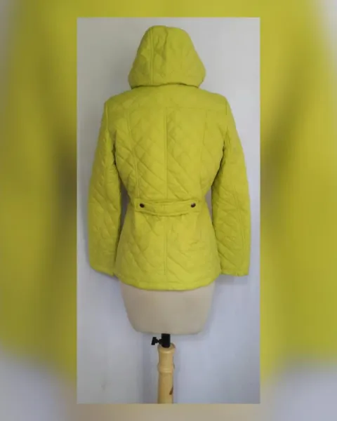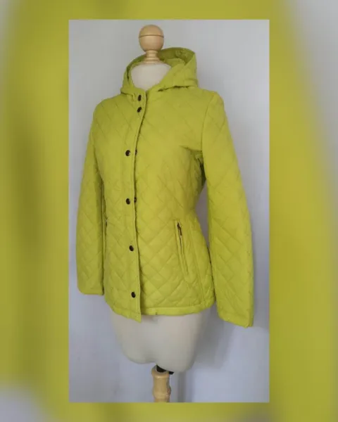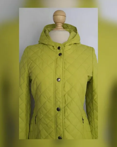 Jacket Acolchada Ligera c/Capucha. Jacket acolchada ligera en tela color VERDE LIMA, cuello redondo, cierre p/snaps, capucha NO DESMONTABLE, 2 bolsos vivo delanteros c/cremallera y forro fantasía interior. Talla M. Dimensiones cms: 38 hombro, 52 axila, 45 cintura, 57 zona baja, 65 largo, 59 largo manga. 100% poliéster. P/lavado en seco.***LA JACKET TIENE UN COLOR MUY BELLO QUE NO CAPTA LA FOTOGRAFÍA***