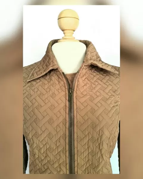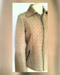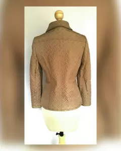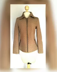 Jacket acolchada ligera efecto brillo color PEANUT, cuello clásico c/solapas, cierre p/cremallera, 2 bolsos vivo delanteros c/cremallera, herrajes tono oro envejecido y forro de fantasía interior. Talla M. Dimensiones cms: 38 hombro, 51 axila, 45 cintura, 54 zona baja, 64 largo, 60 largo manga. 100% Poliéster. P/lavado en seco.***El capitonado y el brillo de la jacket es muy bello y delicado, y no lo capta la fotografía.***