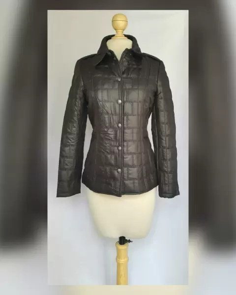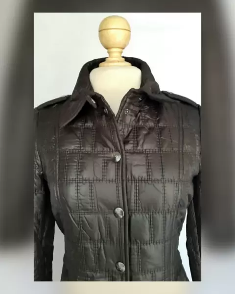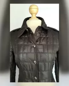 Jacket acolchada ligera en tela color NEGRO ÉBANO efecto brillo, cuello clásico c/solapas, charreteras en hombro, cierre p/snaps, 2 bolsos vivo y forro fantasía interior. Talla M. Dimensiones cms: 40 hombro, 53 axila, 47 cintura, 56 zona baja, 65 largo, 59 largo manga. 100% poliéster. P/lavado en seco.***LA JACKET TIENE UN COLOR Y UN BRILLO MUY BELLO QUE NO CAPTA LA FOTOGRAFÍA***