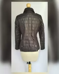 Jacket Acolchada Ligera NEGRO ÉBANO. Jacket acolchada ligera en tela color NEGRO ÉBANO efecto brillo, cuello clásico c/solapas, charreteras en hombro, cierre p/snaps, 2 bolsos vivo y forro fantasía interior. Talla M. Dimensiones cms: 40 hombro, 53 axila, 47 cintura, 56 zona baja, 65 largo, 59 largo manga. 100% poliéster. P/lavado en seco.***LA JACKET TIENE UN COLOR Y UN BRILLO MUY BELLO QUE NO CAPTA LA FOTOGRAFÍA***