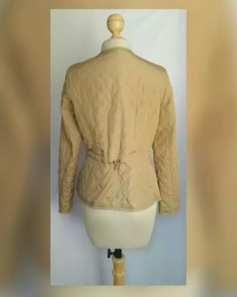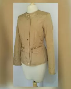 Jacket acolchada ligera efecto brillo color DORADO AVELLANA, cuello redondo, cierre p/cremallera oculta p/tapeta c/snaps, 2 bolsos plastrón delanteros c/cremallera y tapeta c/snaps, elástico trasero ajustable en cintura y forro fantasía interior. Talla M. Dimensiones cms: 38 hombro, 53 axila, 46 cintura, 57 zona baja, 52 largo, 62 largo manga. 100% poliéster. P/lavado en seco.***LA JACKET TIENE UN BRILLO Y UN COLOR MUY BELLO QUE NO CAPTA LA FOTOGRAFÍA***