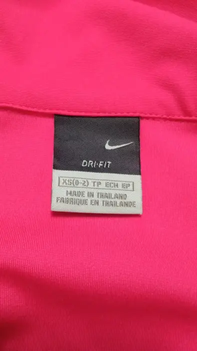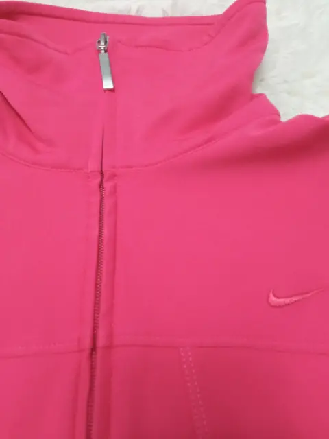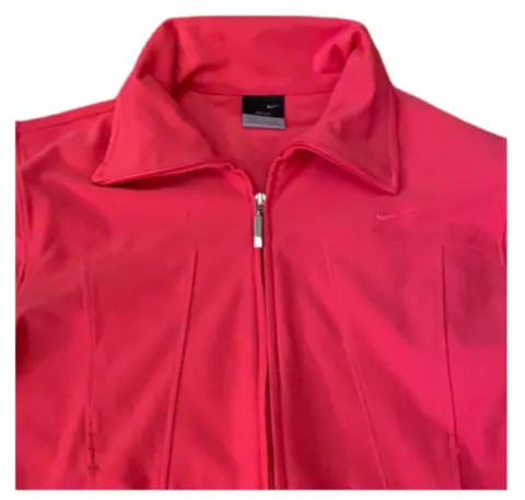 Nike Dri-Fit chamarra corta, cuello alto.. Nike Dri-Fit chamarra corta con cuello alto en color Rosa brillante, talla XS.Medidas: 43 cm de largo, 76 cm espalda-pecho, 78 cm de ancho en cintura 60 cm de largo en mangas. Cuello 10 cm de alto y 38 cm ancho.Materiales: 88% poliéster y 12 % spandex.Cierre con cremallera, botón a presión en los puños, dos bolsillos laterales, muy poco uso en excelente estado.Disponible 🤗