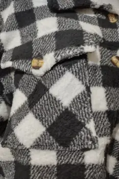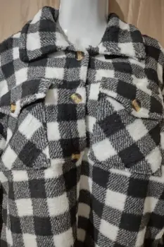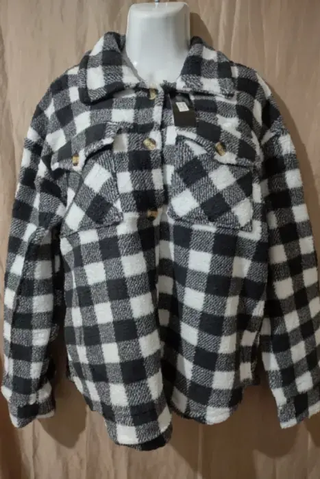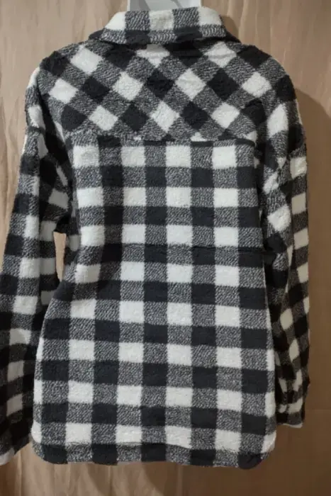 Cómoda sudadera a cuadros, de peluchito, negro con blanco. Nueva, talla L.Super calientita, con cuello tipo camisa, botones adelante, bolsas de parche con botones.Medidas:Hombro: 55 cmAxila: 57 cmLargo: 70 cm