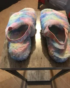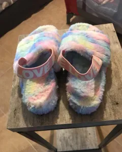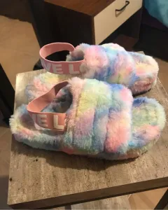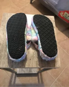 Chanclas de peluche. Sandalias con peluche en modelo arcoiris , talla #3 con un poco de plataforma , practicamente nuevas!