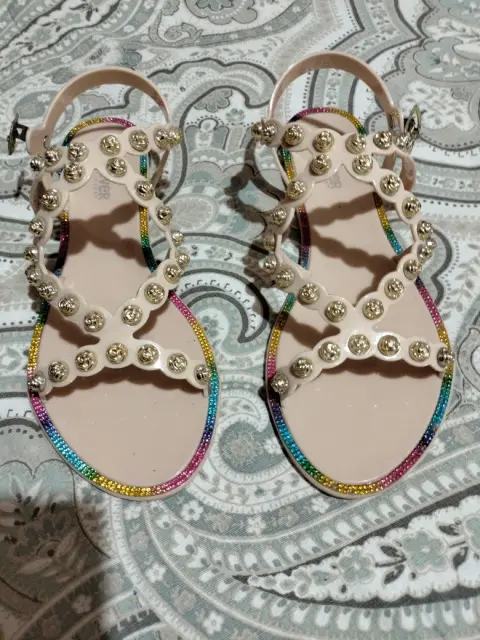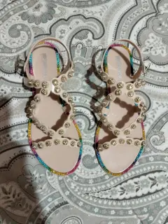 Multicolor, talla 6 mexicano. De plástico, ideales para caminar en la arena, y muy cómodos.