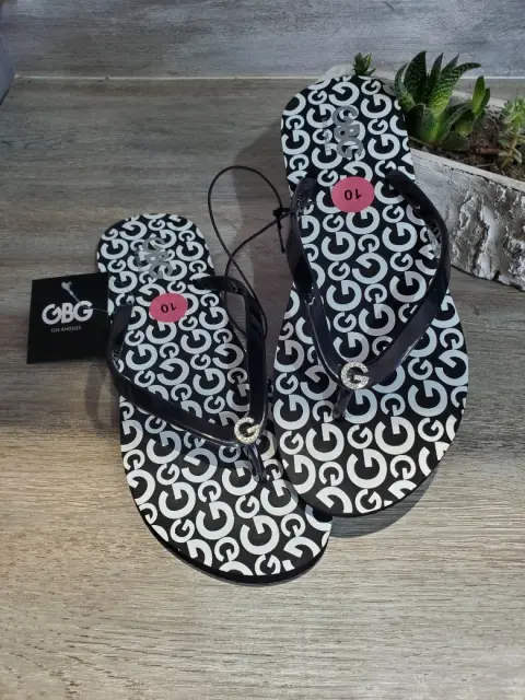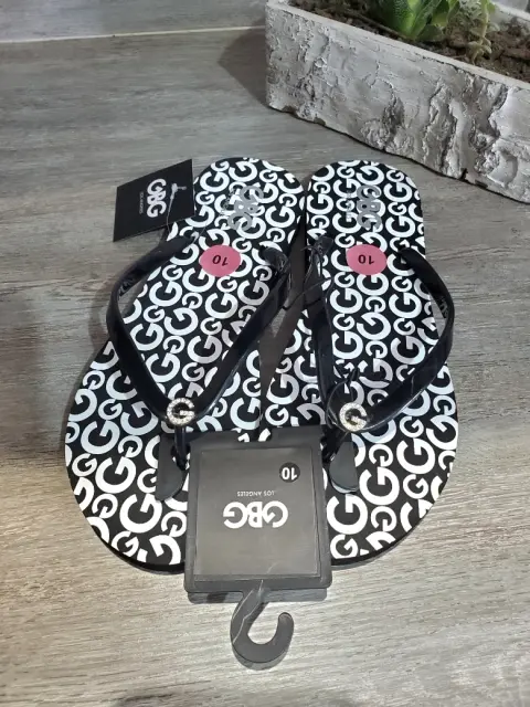 SUPER COMODAS Y PRACTICAS SANDALIAS GUESS GBYG- ESTILO PLAYERO/ CASUAL- GGDARCEY3-C- TONO NEGRO CON MONOGRAMA DE LA MARCA EN BLANCO- TALLA 7M MEX. 10M USA- INICIAL DE LA MARCA EN TONO PLATEADO CON DISEÑO EN PEDRERIA
