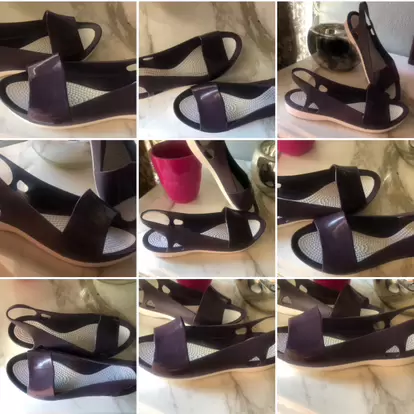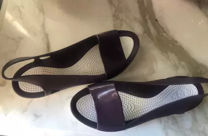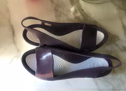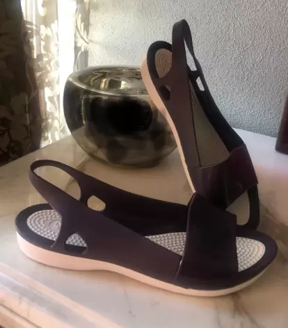 Sandalias tipo crocs. Sandalias tipo crocs en color uva , están marcadas como talla 10 , pero son 6 pie delgado o 5 1/2 mexicano . Las compre aquí pero me quedan justas soy 6 pie ancho . Tal cual las recibí , indicaba solo probadas .