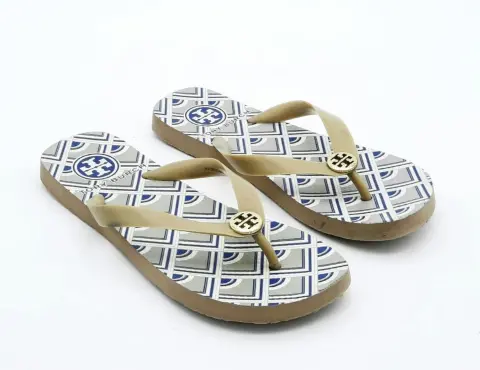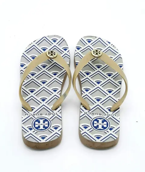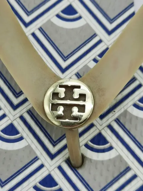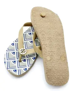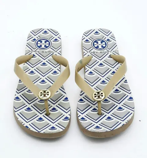 Flip Flops Tory Burch con tiras finas y suela estampada. Tienen un logotipo dorado de la firma Tory Burch en la puntera.Una de ellas tiene una manchita en el interior de la tira sintética.