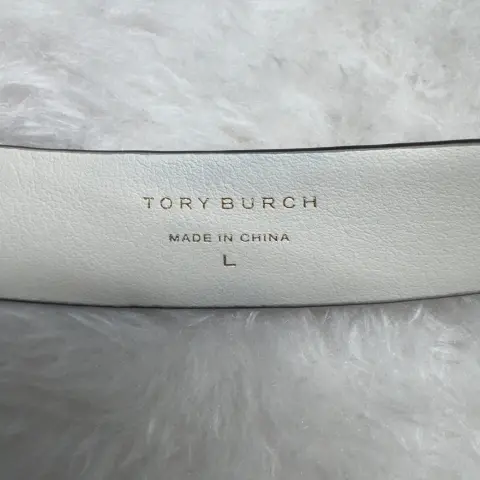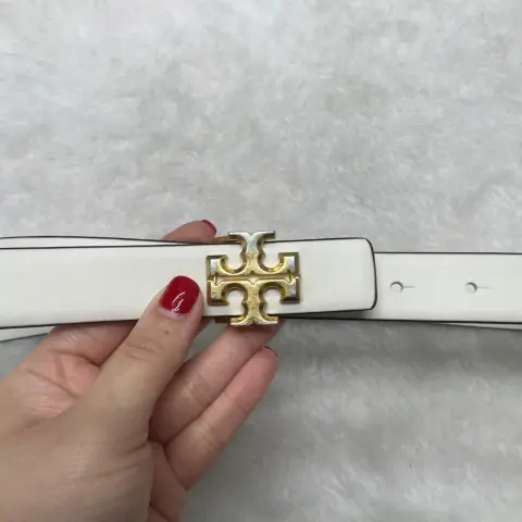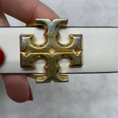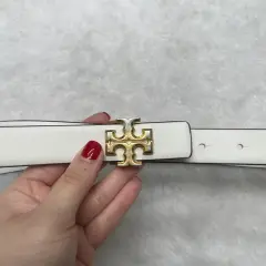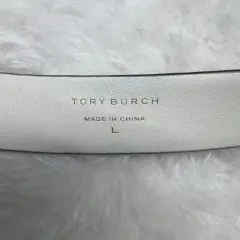 Cinto marca Tory Burch talla L de piel color blanco, tiene herraje dorado y algunos detalles de uso (principalmente en la hebilla).