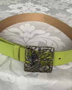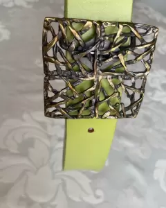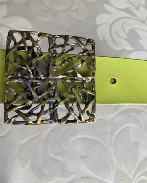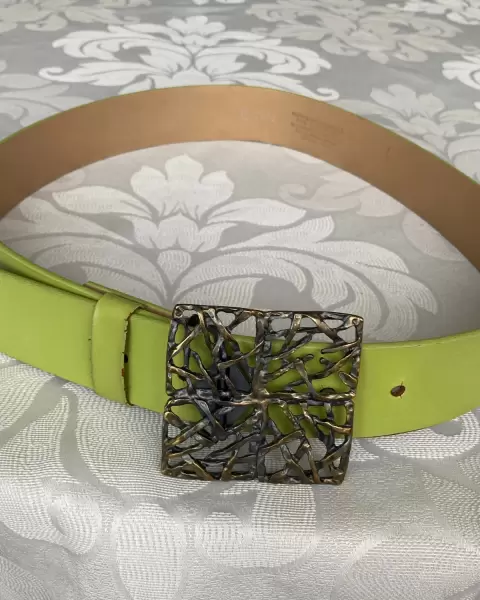 Hermoso cinturón de piel, color verde limón, hermosa y artística hebilla, 3 Cm de ancho, largo 96 Cm, hebilla 5.5 Cm X 5.5 CM.